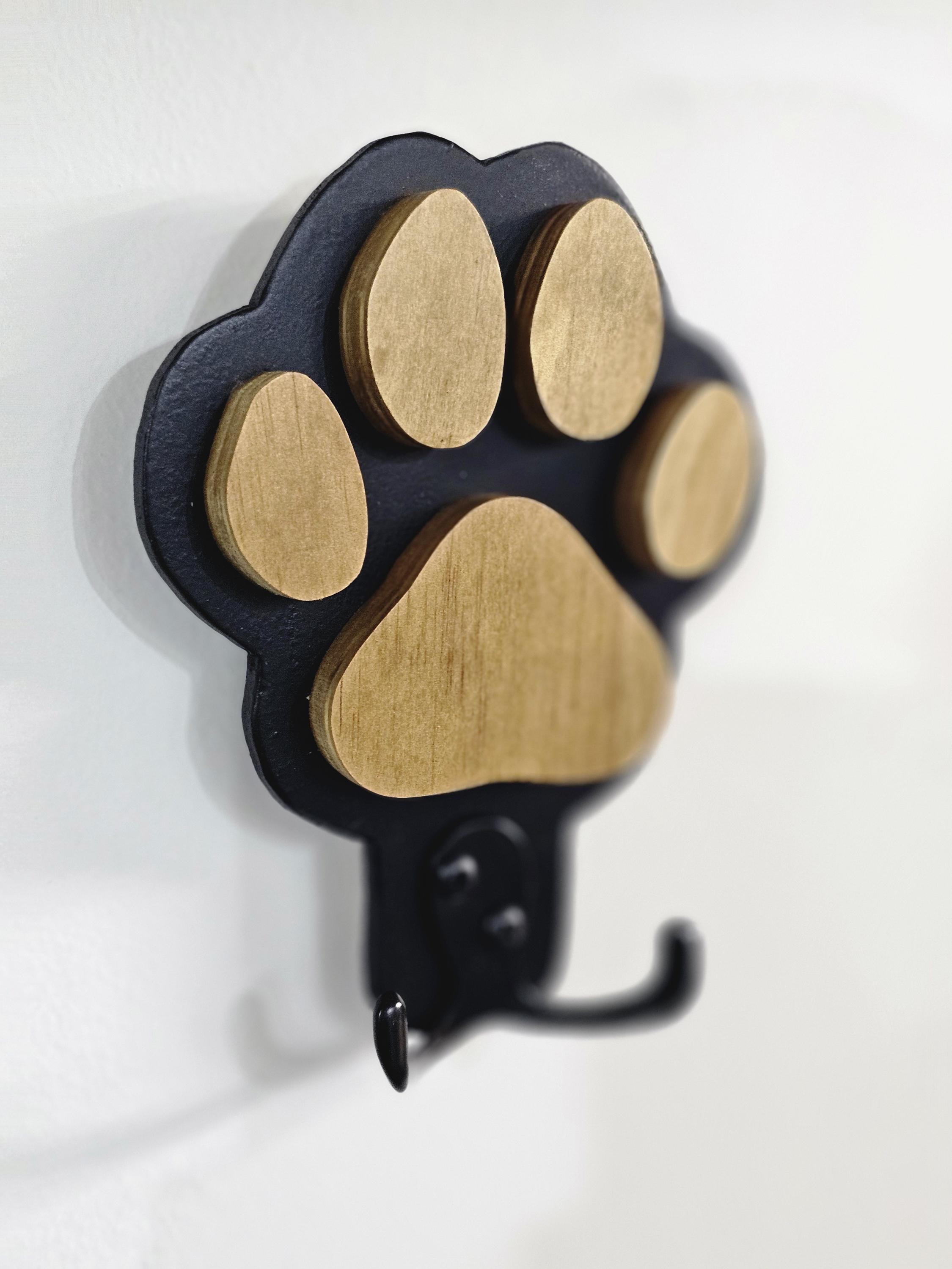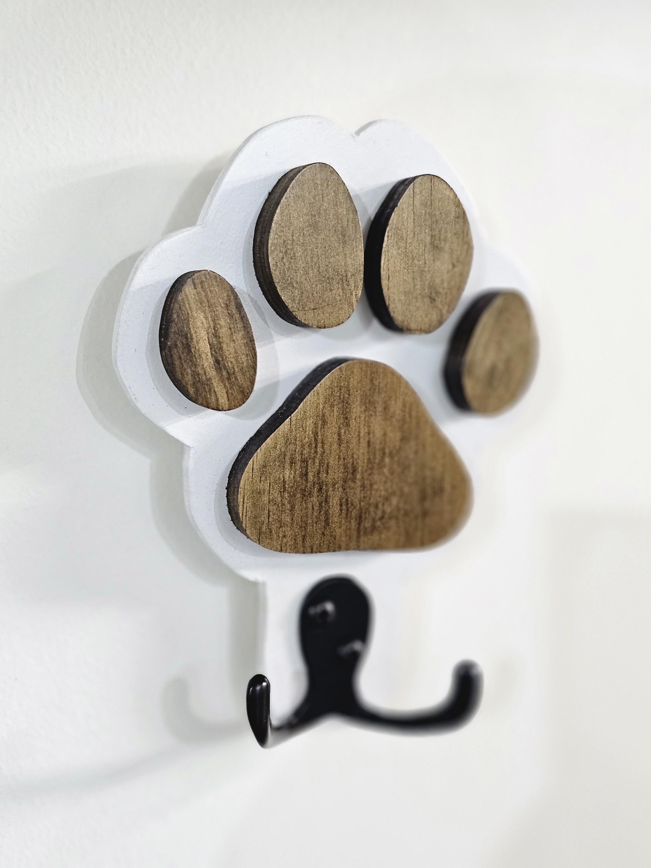 Crafted from durable wood and finished by hand, this hook features a raised paw print design and a sturdy metal hook – ideal for holding leashes, collars, keys, or small accessories.