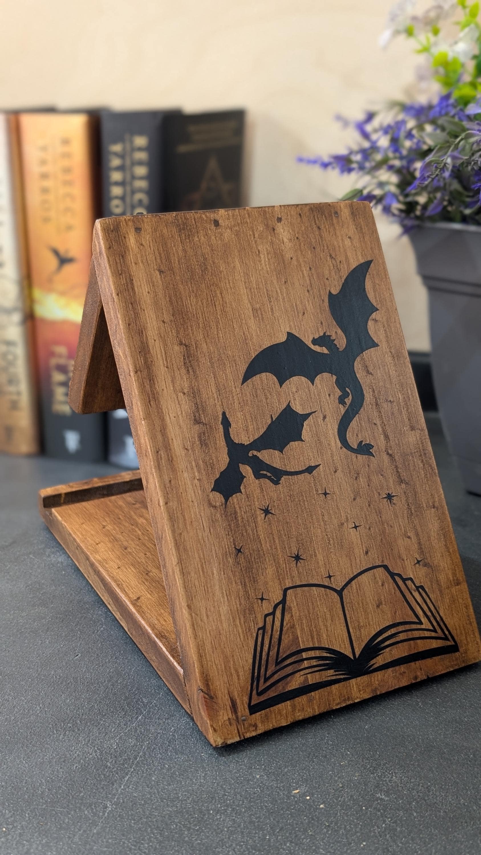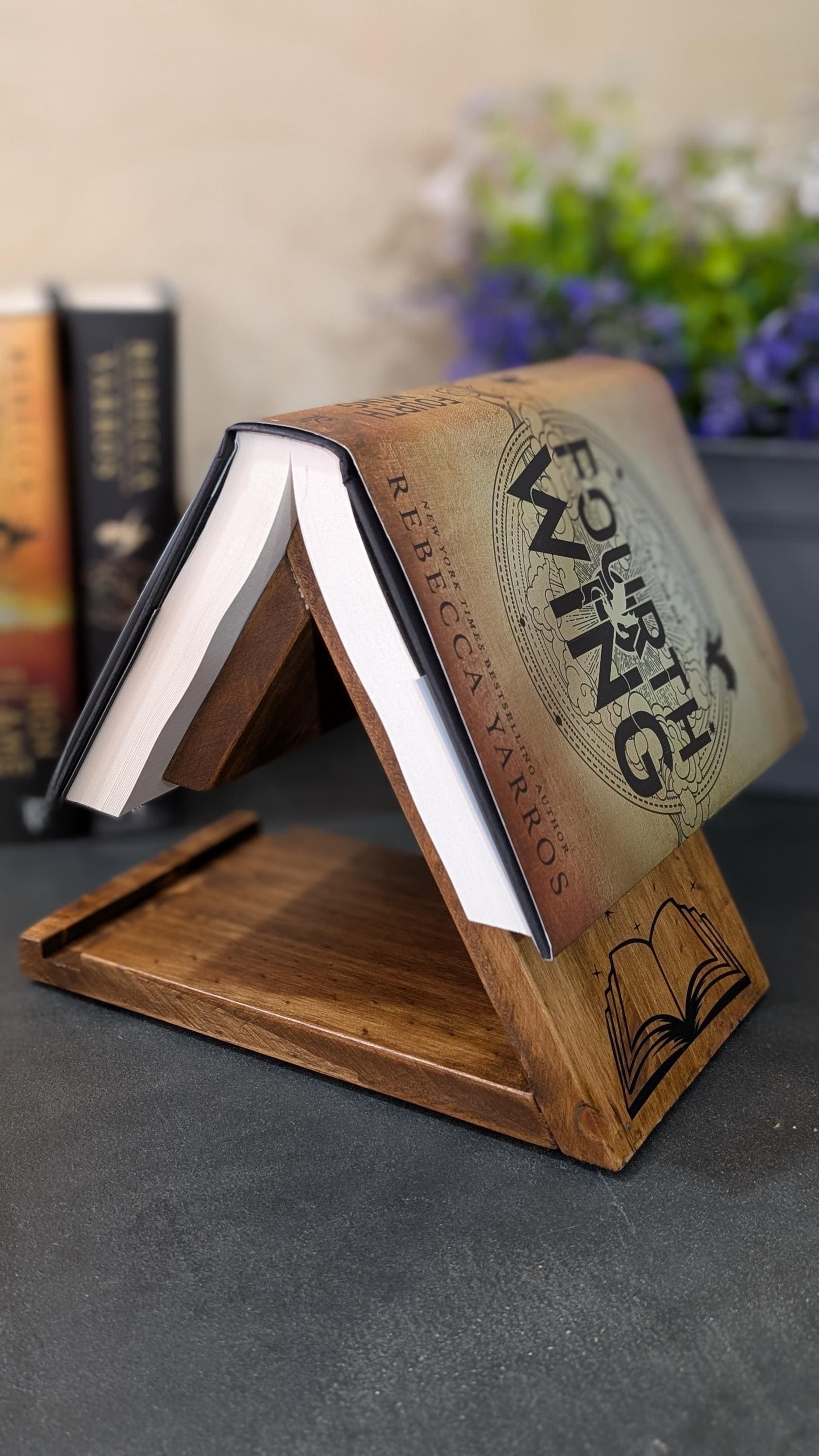 Made from quality wood and finished with smooth, soft edges to protect your book spines, this stand features non-slip rubber feet and a convenient spot to rest your eyeglasses. Choose from 2 wood finishes and 8 beautifully engraved designs – including dragons, fantasy themes, BookTok favorites – or make it truly yours with a custom design.