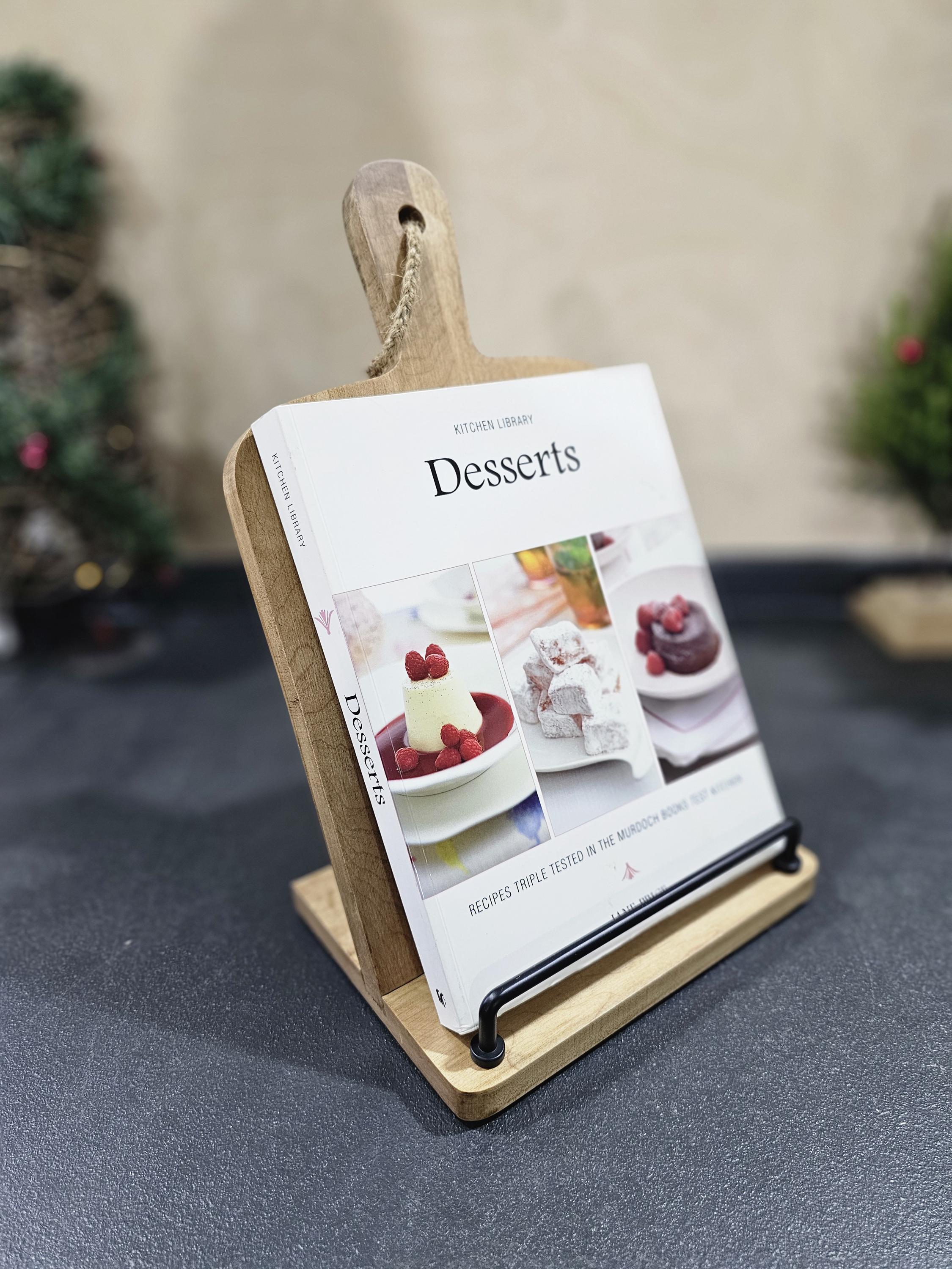 Bring both function and charm to your kitchen with this handcrafted wood cookbook stand, thoughtfully designed in the shape of a classic cutting board—complete with a handle for easy movement or hanging when not in use.