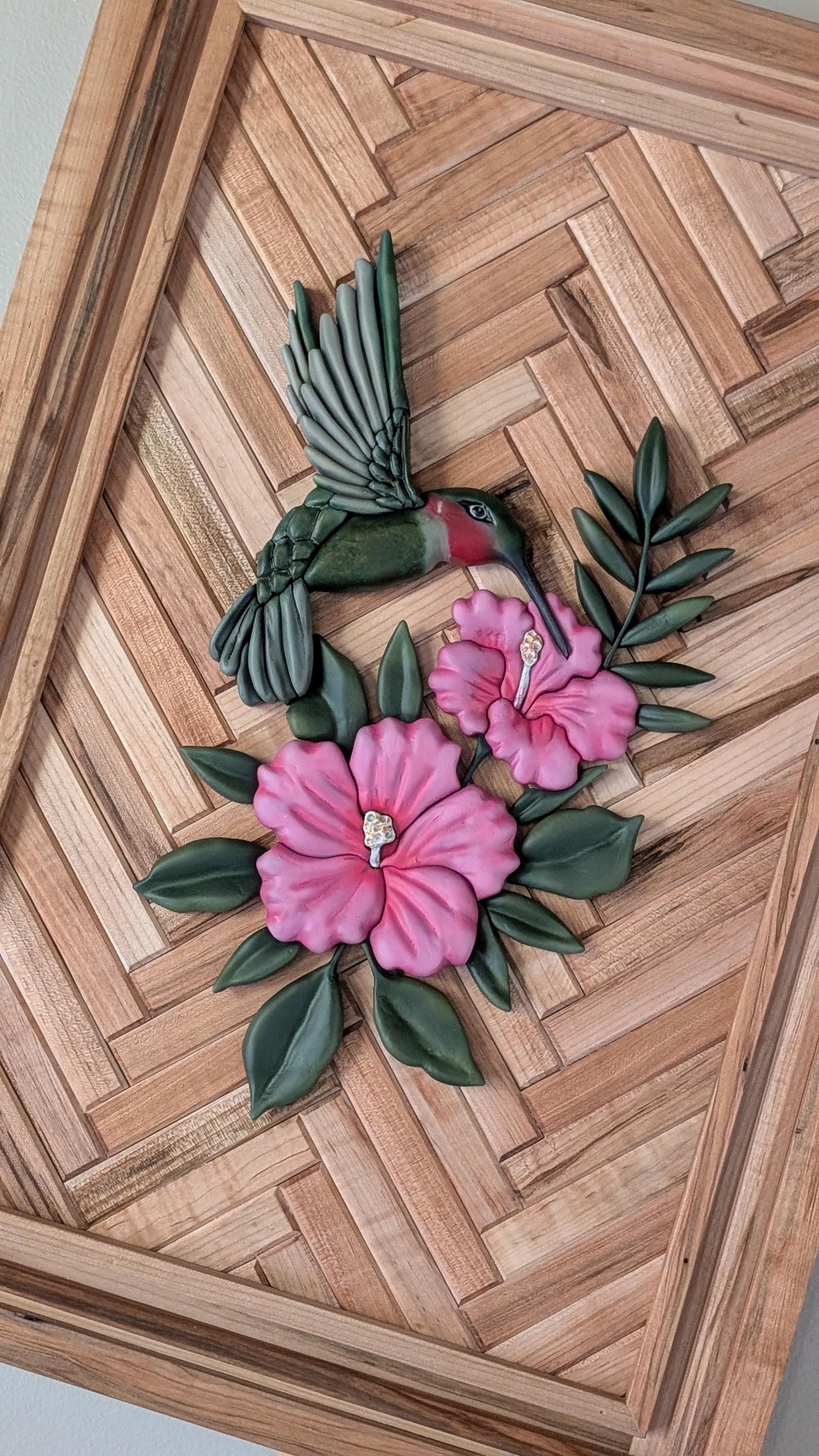 - Intricately carved hummingbird and hibiscus flowers, full of movement and fine detail
