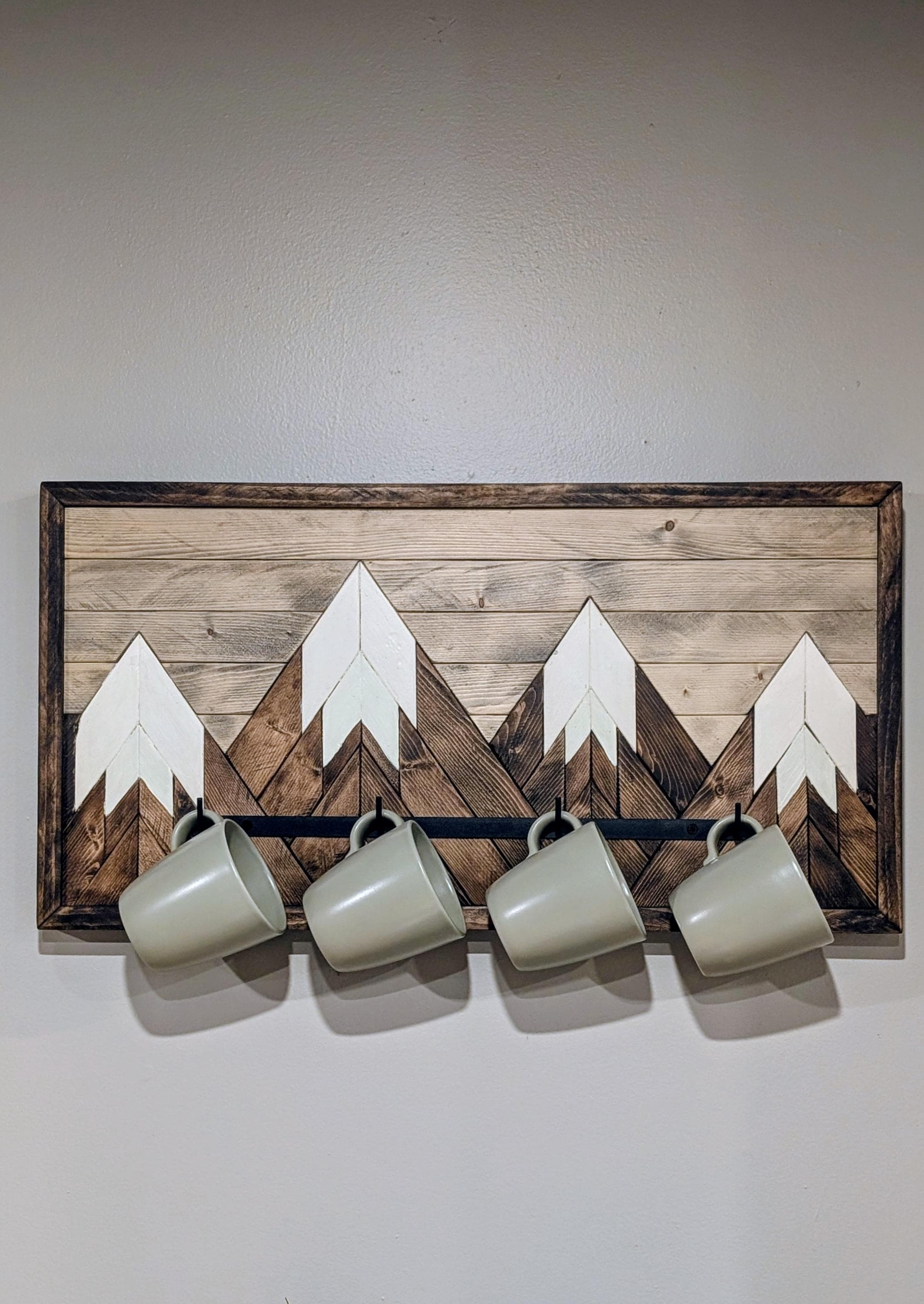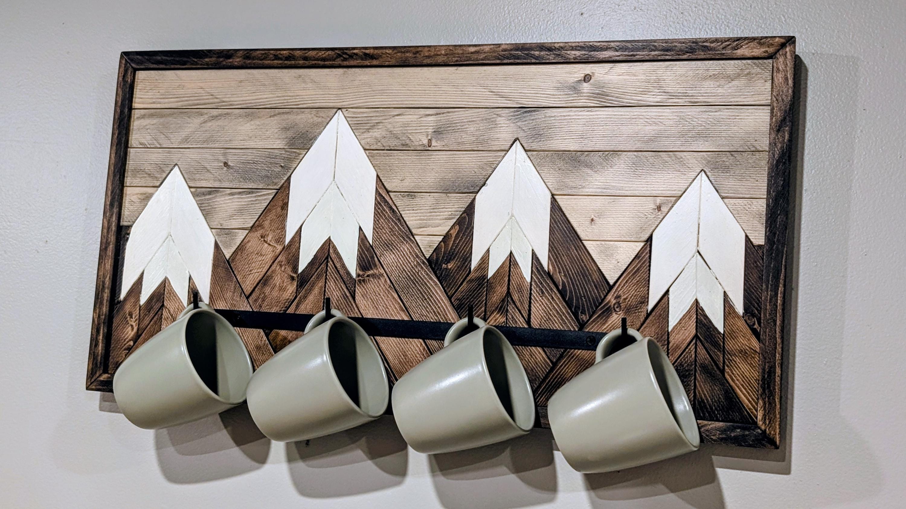 Perfect for coffee lovers, cabin décor, or rustic kitchens—this mountain mosaic mug rack adds warmth, personality, and function to any wall. ☕🏔️