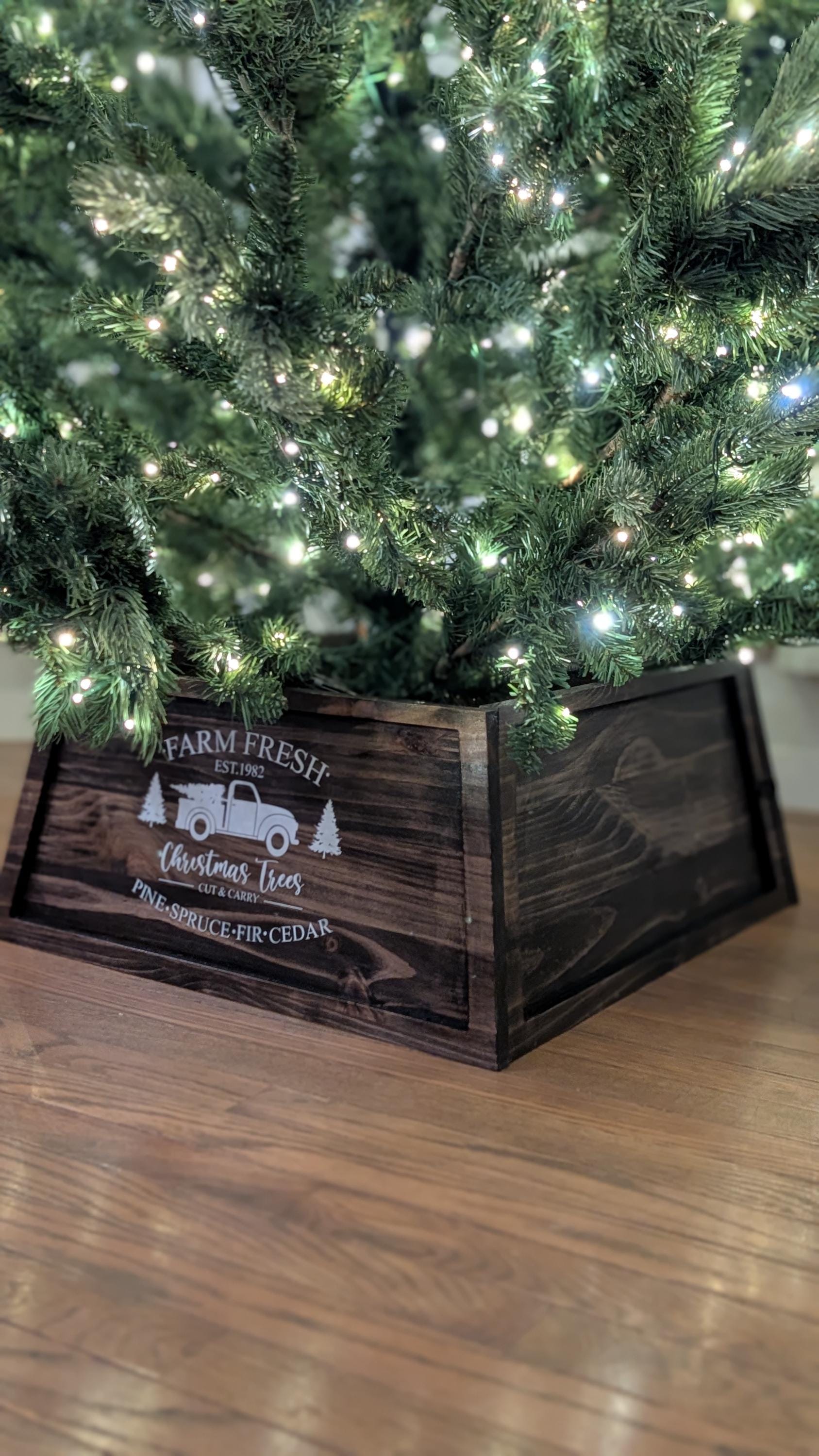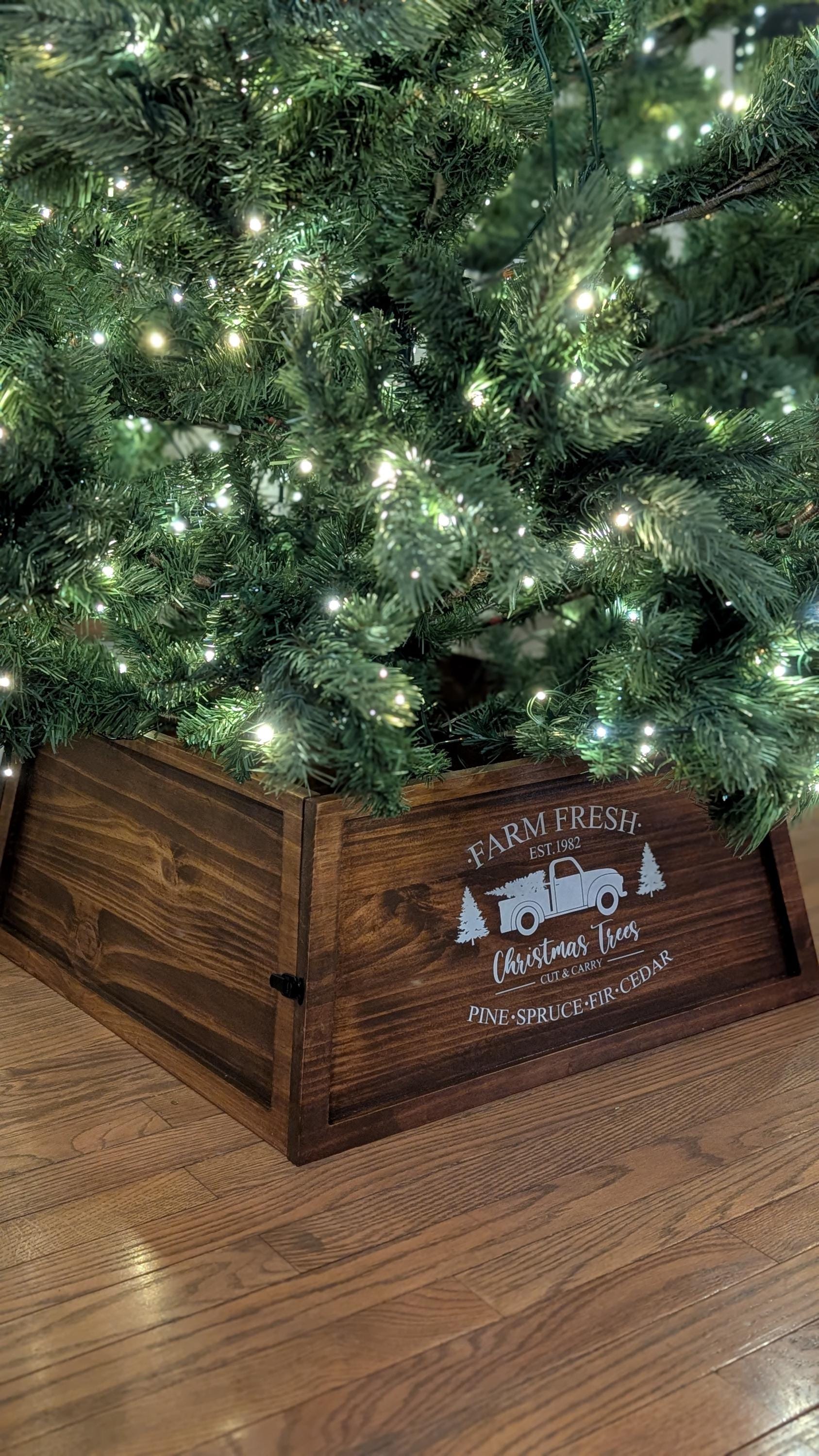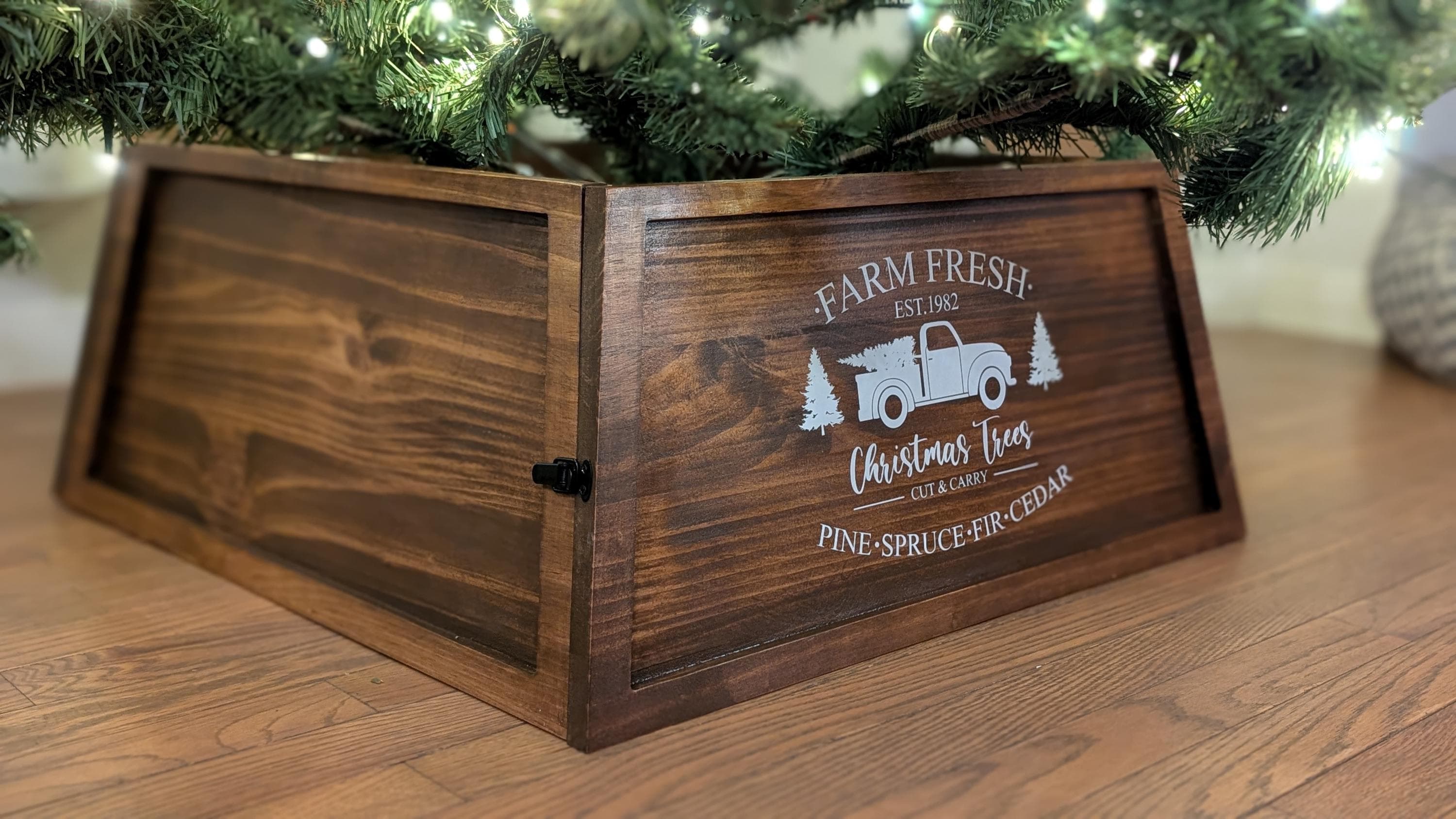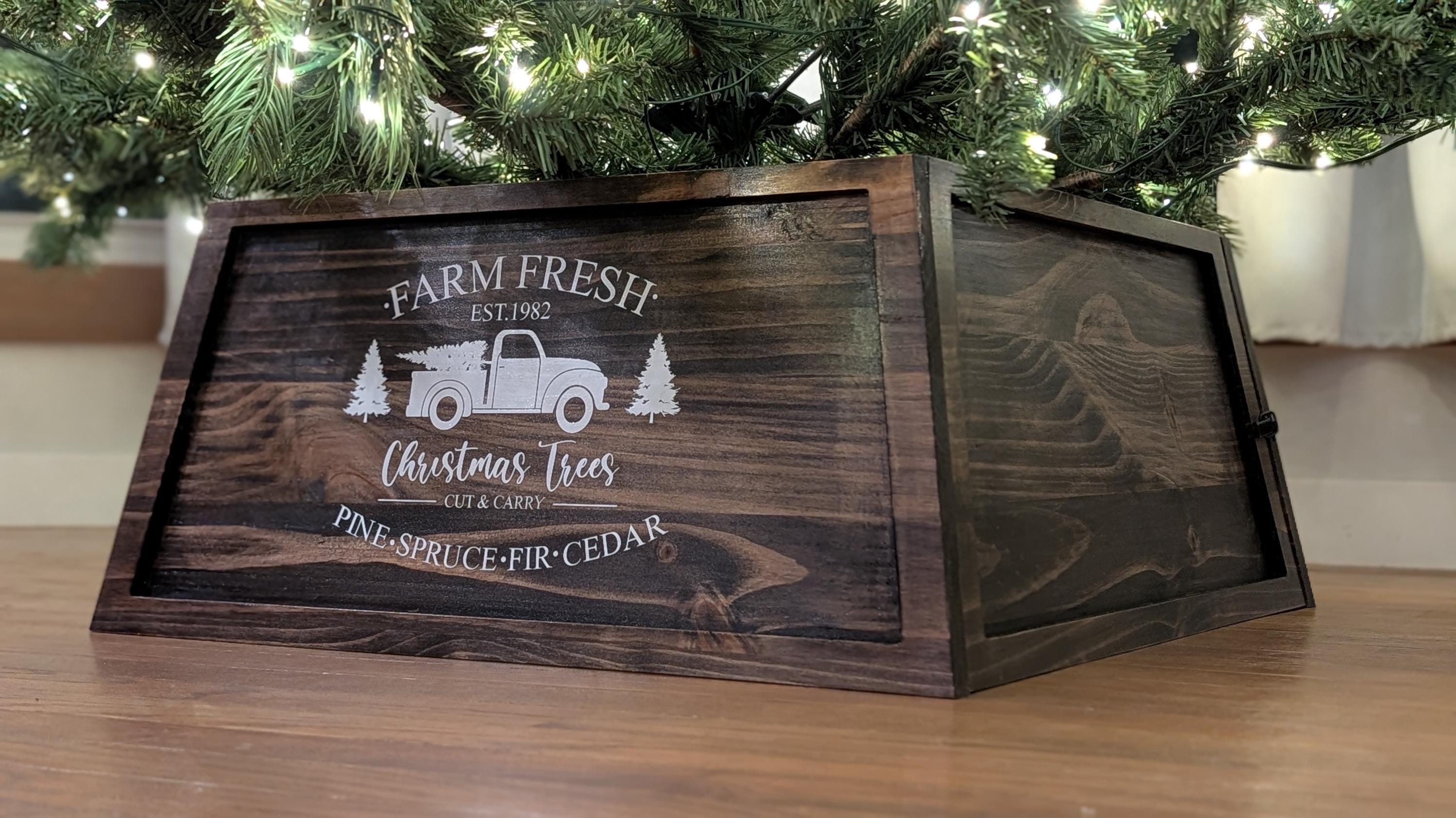Add rustic farmhouse charm to your holiday setup with this handcrafted Wooden Christmas Tree Skirt, featuring a beautiful tapered design and a “Christmas Tree Farm” design on the front panel. Each piece is carefully built from solid wood and finished in your choice of two standard stain options, bringing warmth and style to your Christmas display.