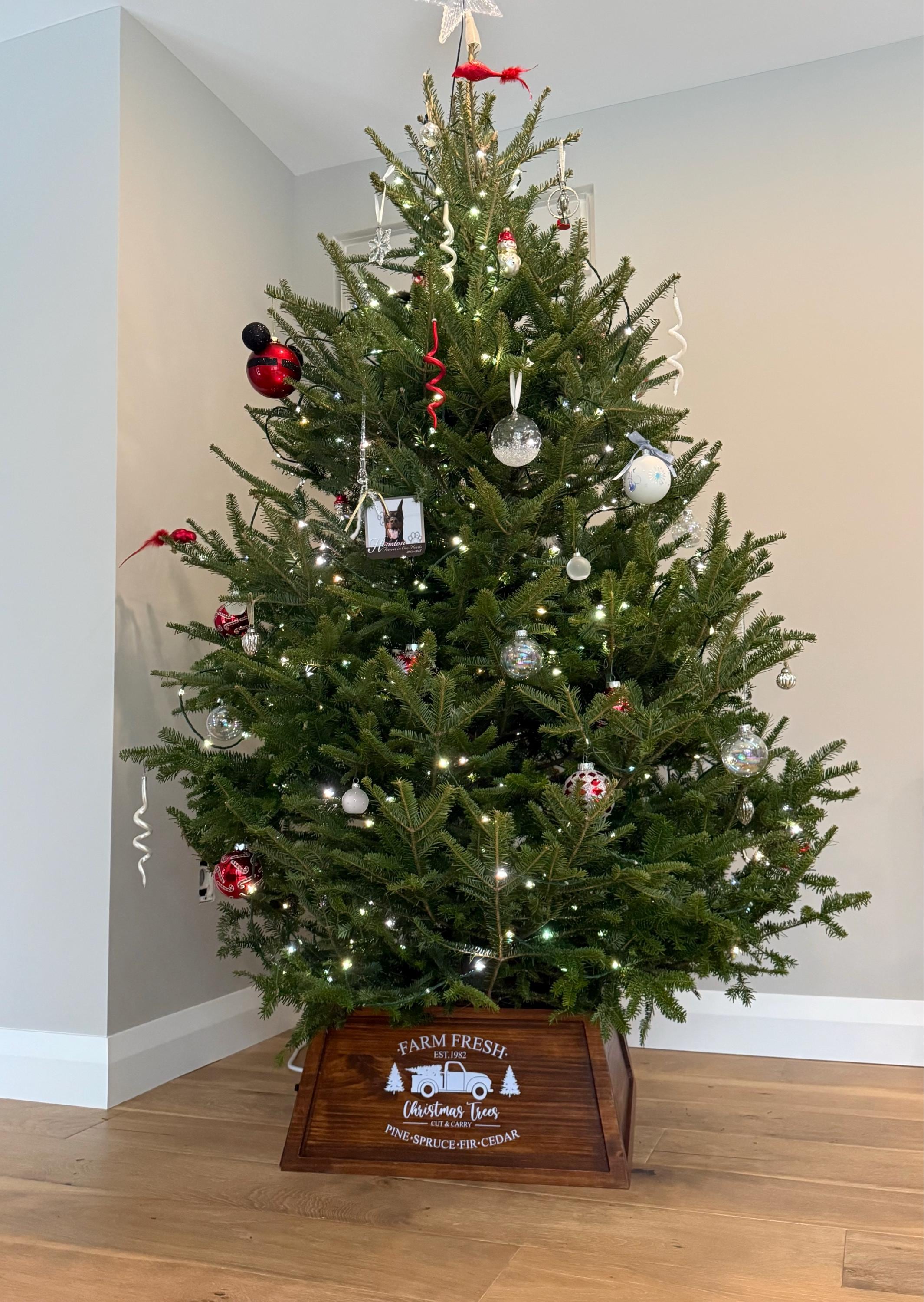 Designed for both beauty and practicality, this skirt features two hinged sections that latch together easily for quick setup. When the season’s over, it folds flat for compact storage—making it as functional as it is festive.